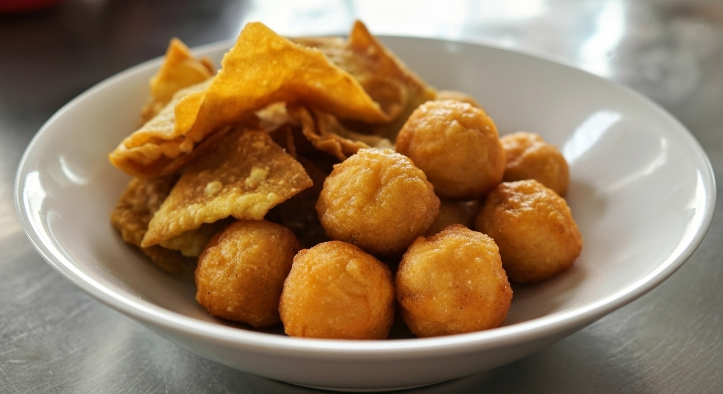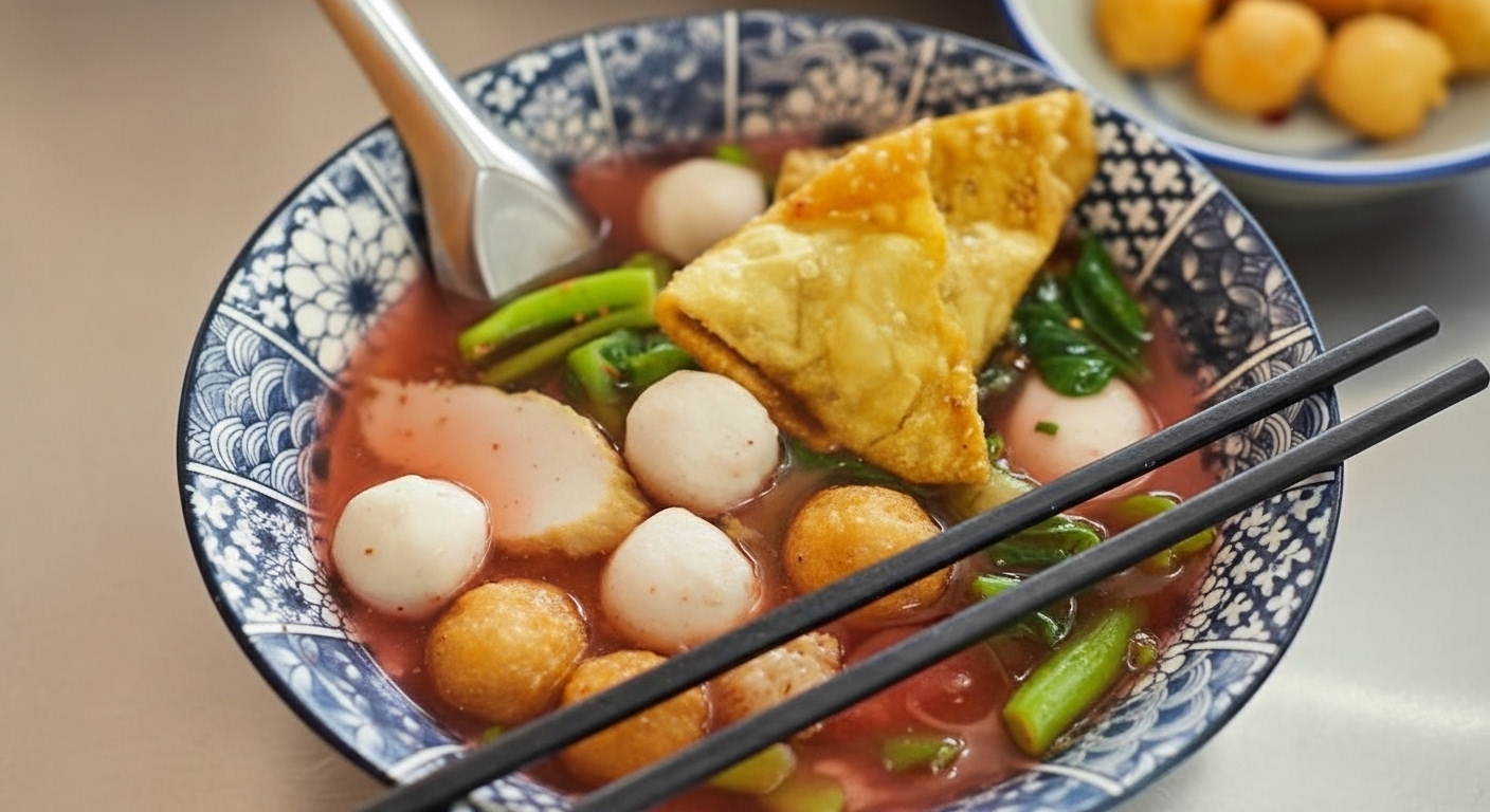 Toppings include crispy pork skin, fish balls, and fried wontons, adding texture and enhancing flavor.