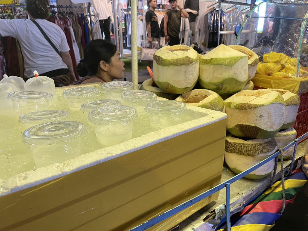 Perfect for cooling down after walking through the market! Vendors crack open fresh coconuts and pour the sweet water into cups. It’s refreshing, natural, and full of electrolytes — ideal for Bangkok’s humid weather.