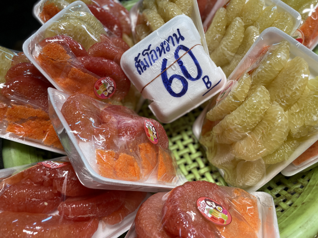 Thai pomelo, or grapefruit, is less sour and more floral than its Western counterpart. Vendors peel and section it beautifully, ready to eat on the go.