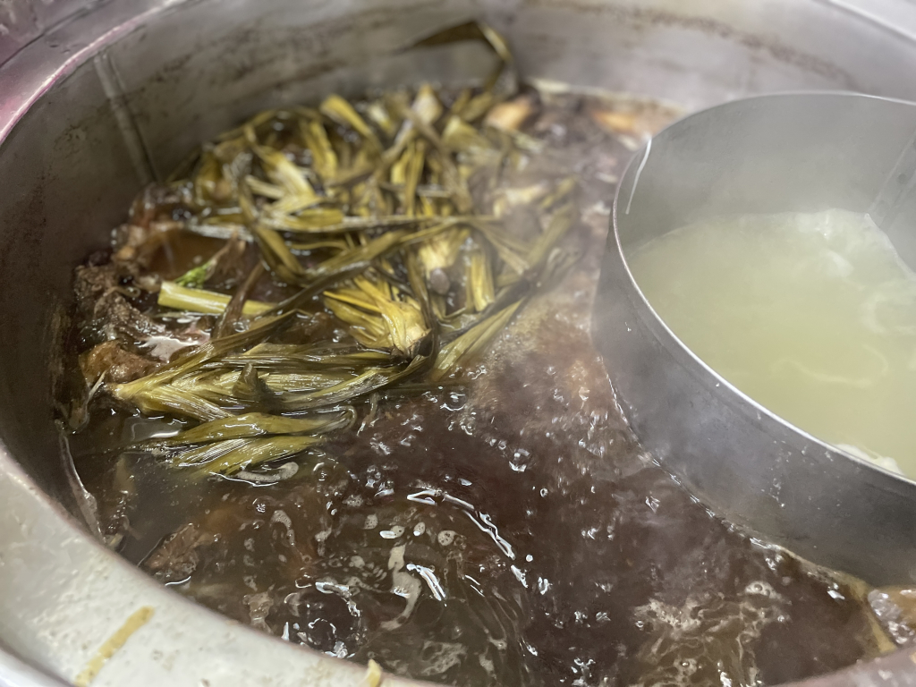 The soup base is slow-cooked with Chinese herbs, spices, and duck, creating a deep, flavorful broth.