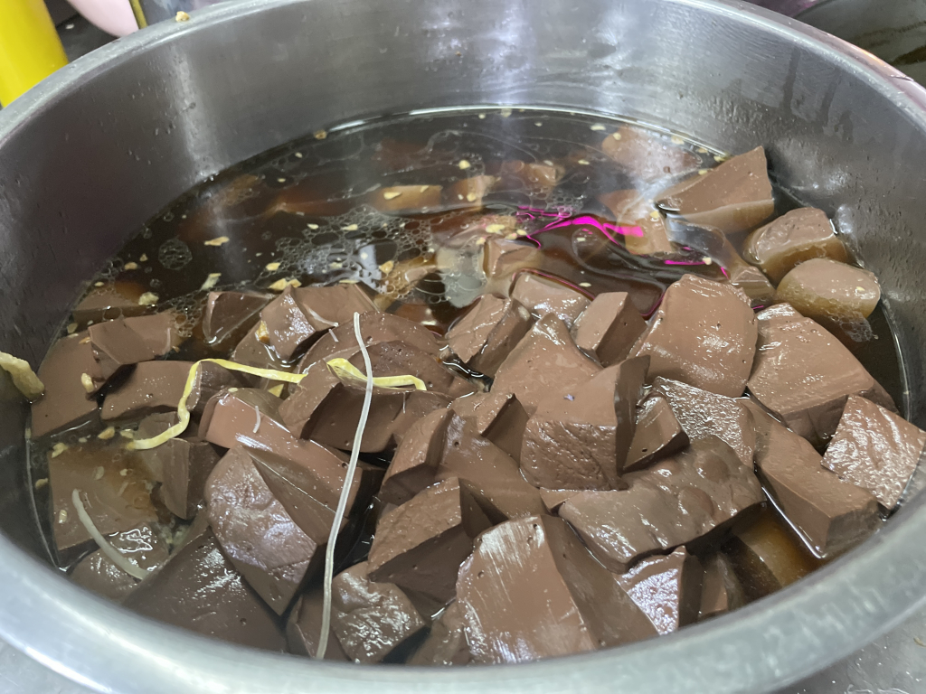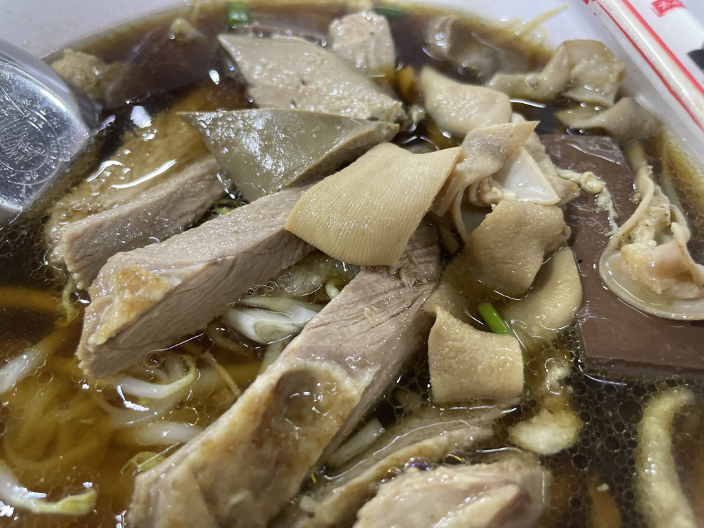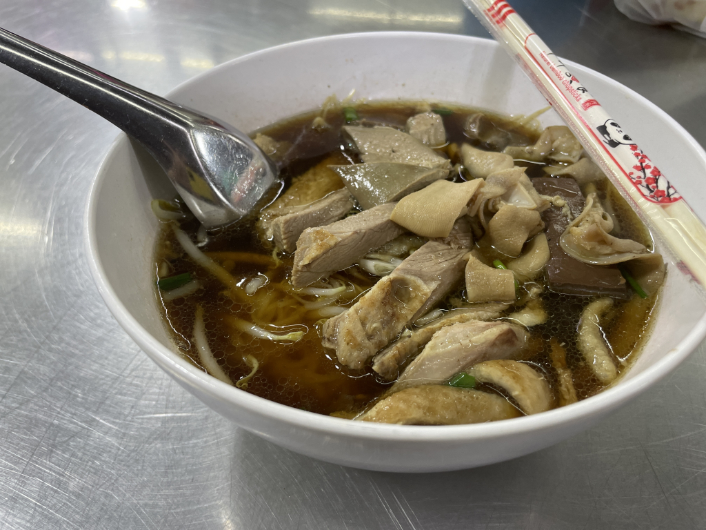 Each bowl of braised duck noodle soup typically comes with duck meat, duck intestines, and duck blood.