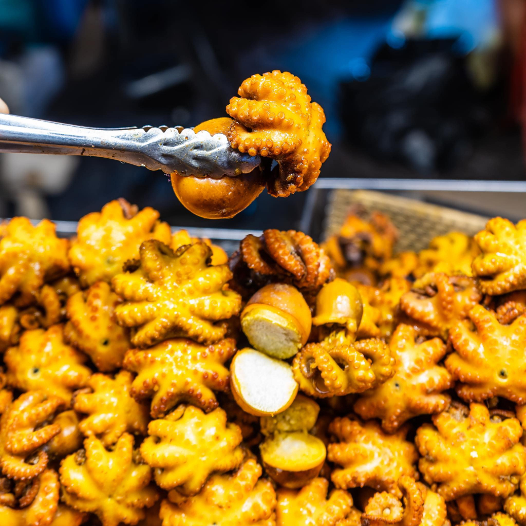 巨大的整隻章魚現烤現切,刷上特製醬料又香又嫩,越嚼越香,非常適合邊逛邊吃。