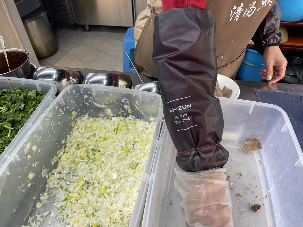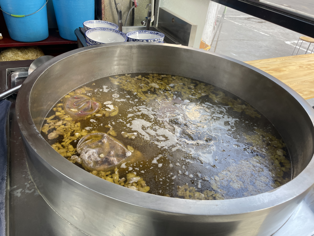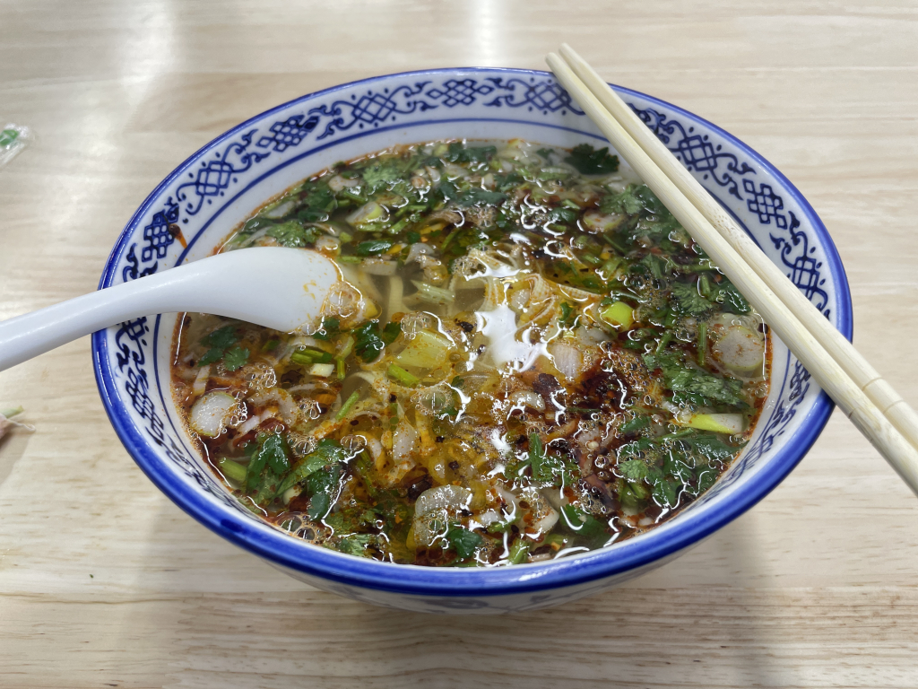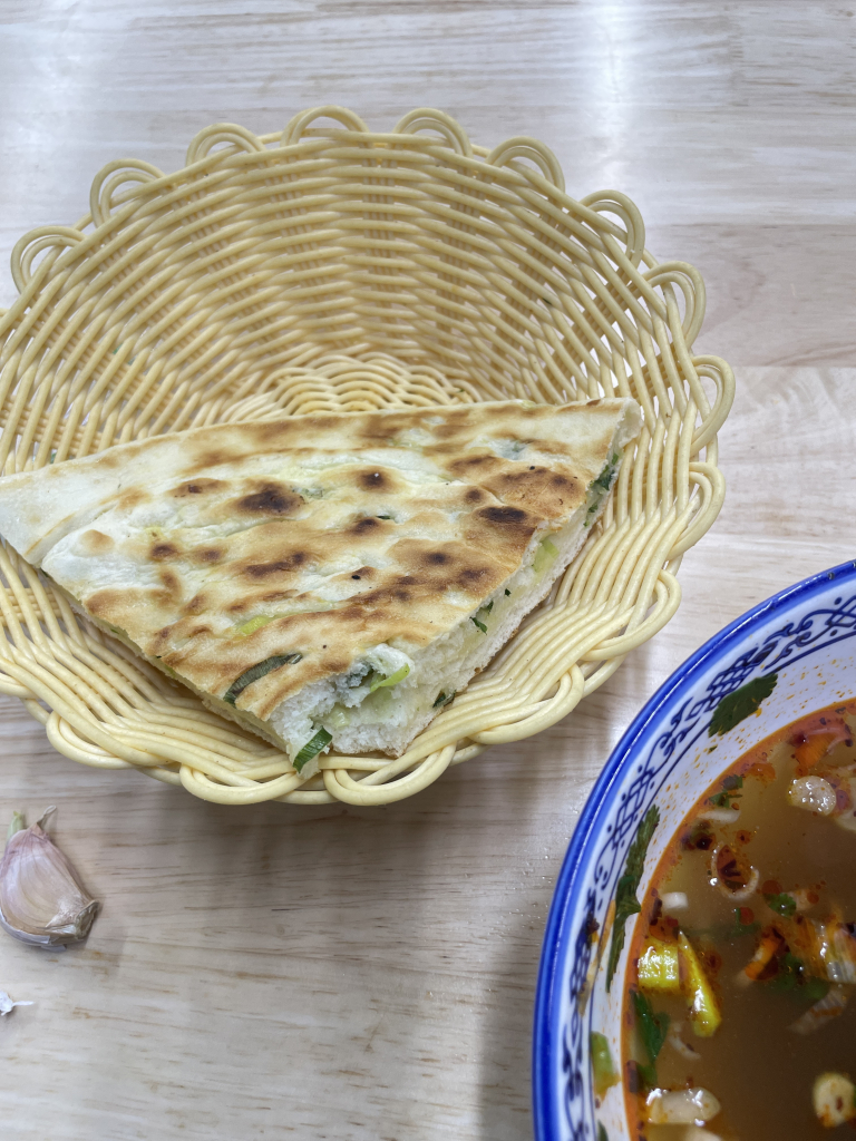 搭配的是一份 蔥花餅,價格僅 1.5元,薄薄一片卻外酥內軟,滿滿的蔥香讓人忍不住沾著湯一起吃。牛肉湯的鮮美與蔥花餅的香脆完美融合,讓這份街頭早餐充滿了幸福感。