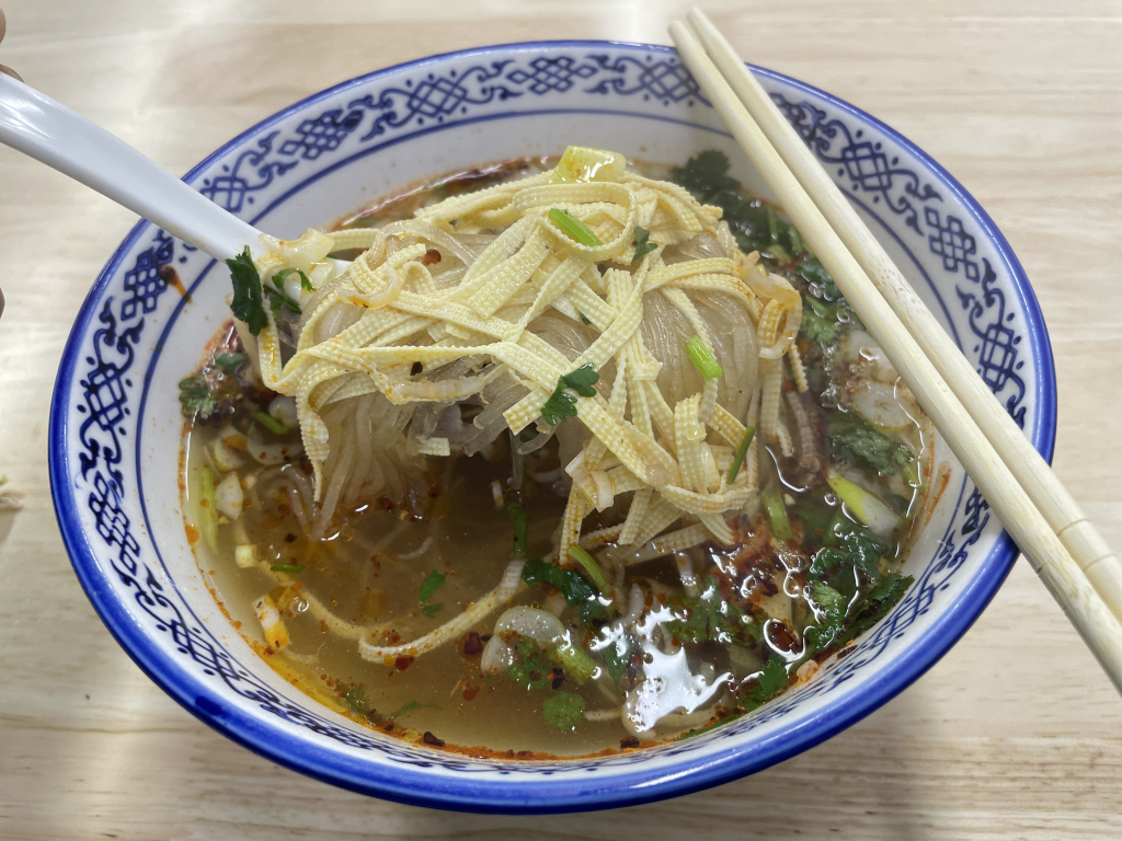 湯裡除了嫩滑的牛肉片,還有 粉絲和腐皮,粉絲吸飽了湯汁,滑順彈牙,腐皮則軟嫩帶有微微的嚼感,讓整碗湯的口感更加豐富,層次感十足。喝上一口湯,清甜鮮美,既暖胃又開胃。